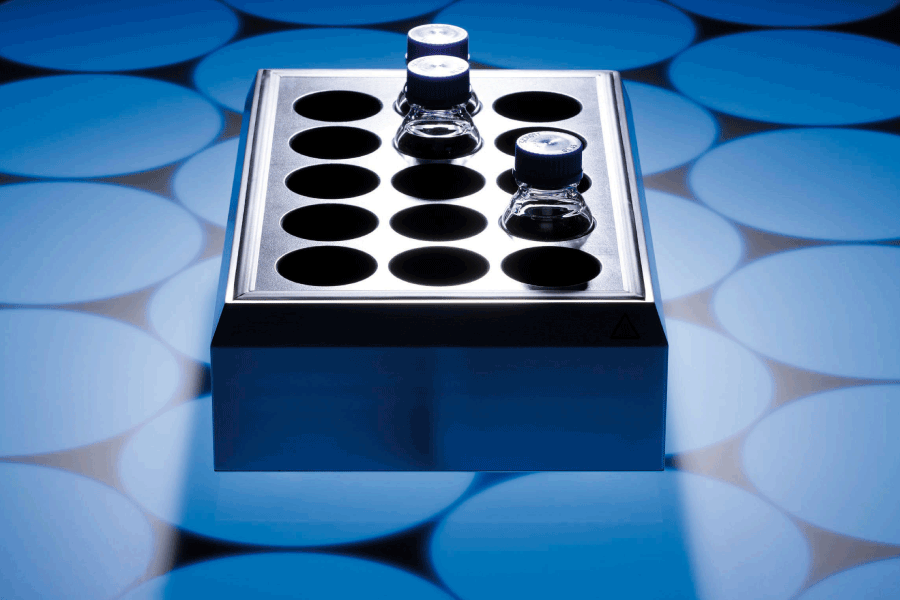 Combinación de bloques de agitación con 15 posiciones de agitación, 15 orificios, ø 57,5 mm, profundidad 48 mm, distancia 65 mm, adecuados para matraces de 100 ml (por ejemplo, Schott) y matraces de 150 ml (forma alta) .