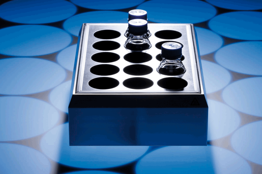 Combinación de bloques agitadores con 8 posiciones de agitación, 8 orificios, ø 87,2 mm, profundidad 78 mm, adecuados para matraces Erlenmeyer de 250 ml.