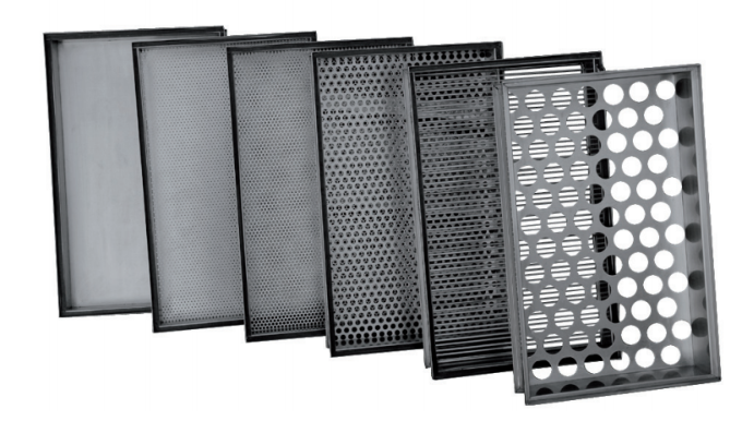 - Juego de tamices estándar: orificio redondo de 45 mm, varilla de 10 mm, varilla de 8 mm, orificio redondo de 7 mm, orificio redondo de 3 mm, bandeja de tamiz